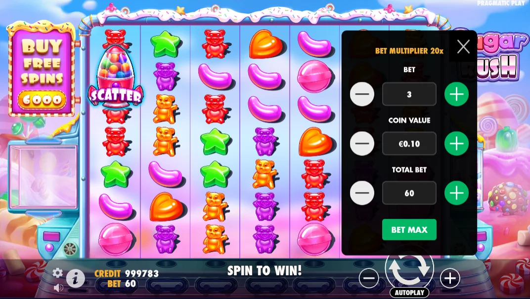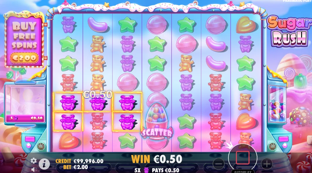 Die Sugar Rush RTP beträgt 96,5% – dies ist das potenzielle Rückgabenniveau, das theoretisch ein Spieler von seinem Einsatzbetrag zurückbekommen kann. Zum Beispiel, wenn Sie 100 Euro setzen, könnten Sie potenziell 96,5 Euro zurückbekommen. Beachten Sie, dass die RTP keine Gewinne garantiert. In Bezug auf die Volatilität ist sie auf einem hohen Niveau. Gewinnkombinationen auf dem Spielbildschirm werden ziemlich selten gebildet, aber sie werden mit hohen Einsätzen bezahlt.